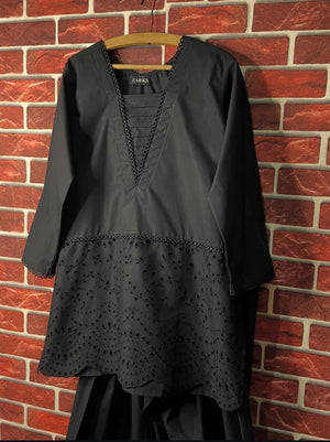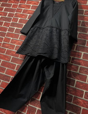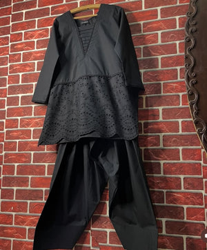 Black beauty is loveFeaturing a core farshi set fully embroidered scallop Chikankari kurta paired with a gracefully flowing farshi shalwar, this ensemble blends elegance with the season's hottest trend - classic black. Perfect for effortless sophistication!